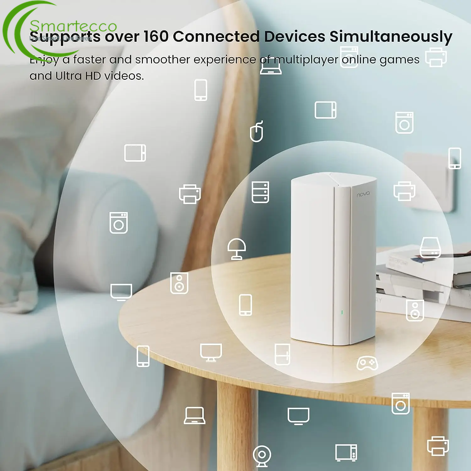 The Tenda AX3000 WiFi 6 Mesh System delivers cutting-edge wireless connectivity with speeds up to 2976Mbps across dual bands. Powered by a high-performance 1.7GHz Quad-Core Broadcom processor, this system provides 66% improved performance over previous generations. The Chinese version EX/MX12 router offers super-fast Wi-Fi 6 technology with MU-MIMO and OFDMA capabilities, supporting over 160 devices simultaneously without lag or interruption.